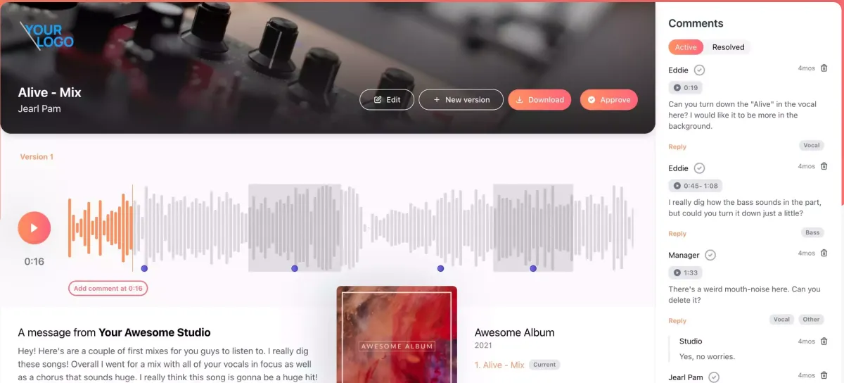 Share lossless audio, control downloads, password-protect links, and deliver through branded collaborator spaces that feel more professional than a basic link or email.